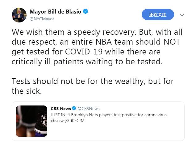 Bill de Blasio转发了媒体的报道,并在旁边写道:“我们希望他们尽快康复。但是,恕我直言,现在有那么多危重病人在等待检测试剂,NBA球队不该做全队检测这种事情。试剂应该留给病人,而不是有钱人。”