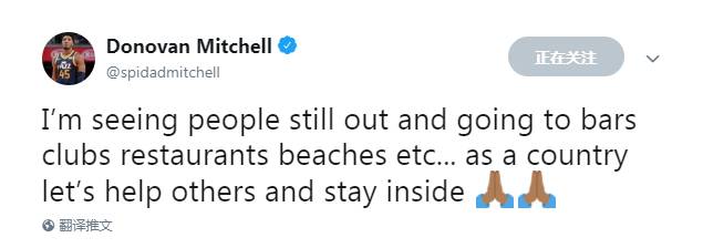 “我看到人们还是呆在外面,去酒吧、逛俱乐部、去餐厅、享受海滩等等。我们都是一个国家的人,让我们帮帮其他人,呆在家里吧。”米切尔在推特上写道。