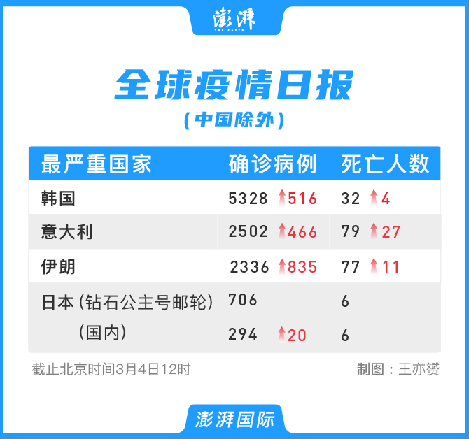新冠肺炎疫情在全球的扩散加快,目前已蔓延至除南极洲以外所有大洲。据澎湃新闻()不完全统计,截至北京时间3月4日12时,在中国以外,各国的确诊病例累计已经超过1.2万例。