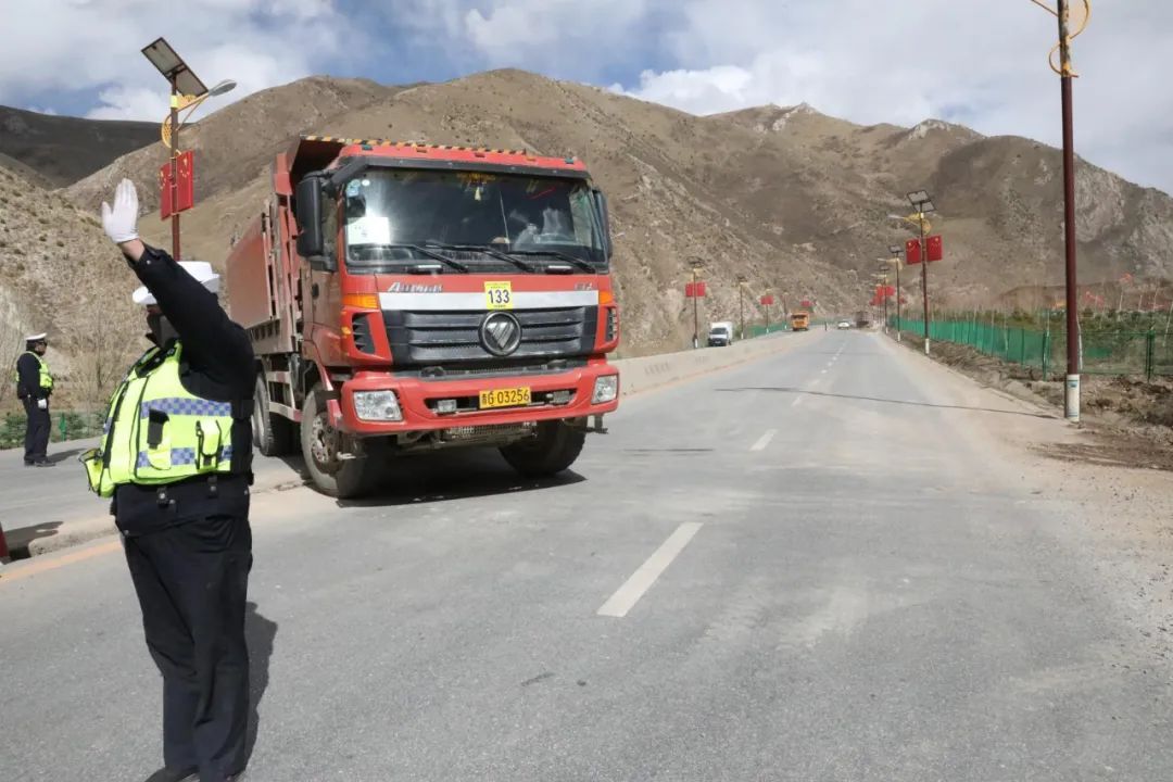 在工地的几处出入口,每当清运渣土车驶入、驶出工地时,负责交通安全的公安交警有序地指挥车辆。玉树市交警大队秩序中队的中队长昂尼玛说:“履行好岗位职责,就是对这次生态修复工作的最好贡献。我们共有9名队员在这里值守,除了维持这个路段的交通秩序,预防事故发生外,我们还要实时开展施工工地车辆运输安全检查。”