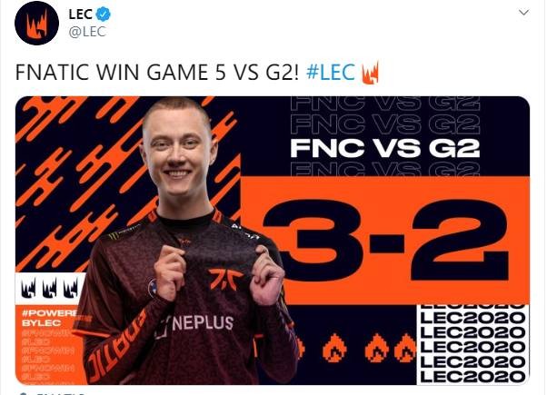 LEC赛果:FNC 3-2击败G2确认前二种子席位!2020-08-30 12:40:40 Twitter 8月30日讯 在今天凌晨结束的LEC夏季赛胜者组的决赛当中
