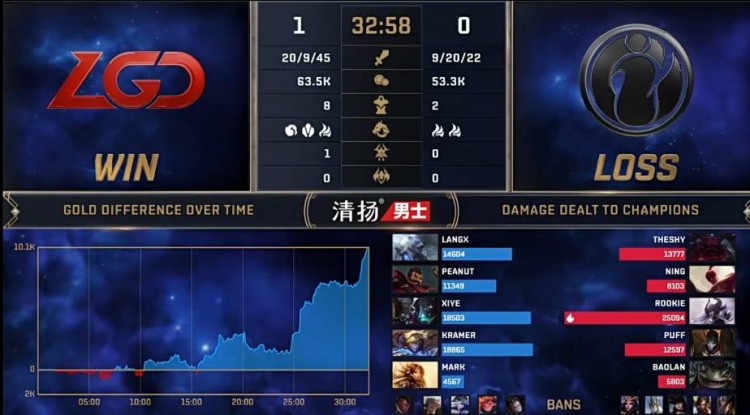 【20:45】LGD先行抢下IG小龙,后续双方爆发团战,IG辛德拉一推五逆转团战,最终完成一波二换三。