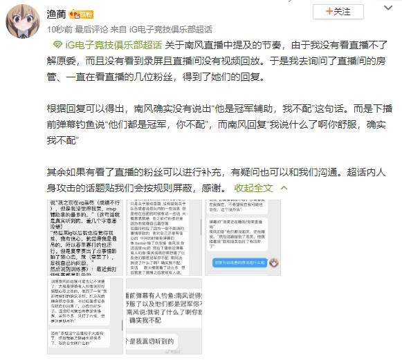 同时在IG战队超话内由帖子对Southwind直播言论进行了澄清,表示南风并没有说出“他是冠军辅助,我不配”这句话。