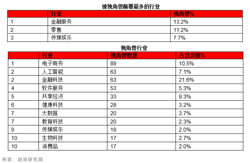 据该榜单统计,金融服务行业是独角兽覆盖最多的行业,占比13.2%。对于覆盖的定义,其指独角兽公司主要通过颠覆现有行业来创造价值。在入榜的独角兽中,金融科技企业有63家,估值总合4030亿美元,约合人民币2.8万亿元,占上榜公司总估值的21.6%。