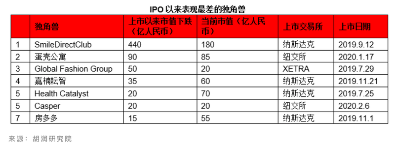 IPO也成了独角兽企业发展的分野。40家去年上榜企业落榜,其中有19家上市。据榜单发布者统计,IPO以来表现最差的独角兽列表中,嘉楠科技在2019年11月21日登陆纳斯达克,市值下降超过40亿人民币。由于嘉楠科技的上市表现,同样从事矿机业务的比特大陆的估值直降500亿至300亿人民币,排行下降50名。