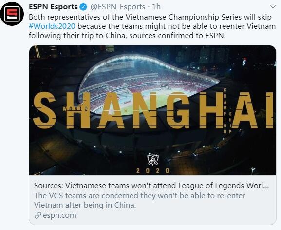 ESPN:越南队伍无法参加 S10 全球总决赛2020-09-01 10:47:58 Twiter 9月1日讯据知情人士告诉 ESPN,由于越南的疫情预防措施,选