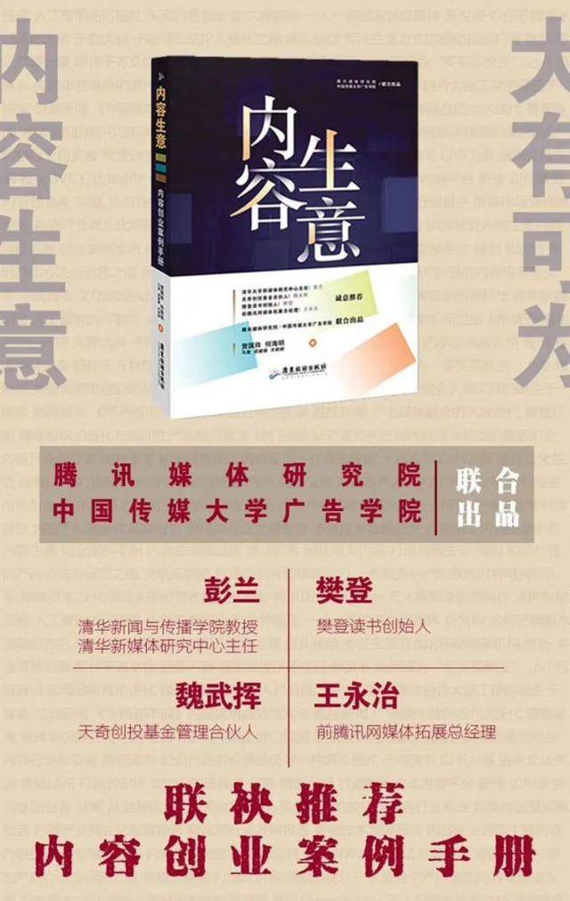 基于此,腾讯媒体研究院联合中国传媒大学广告学院联合推出《内容生意:内容创业案例手册》,帮助媒体人洞察媒体行业、发掘真实想法。