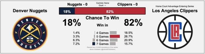 据统计,快船本轮系列赛有82%的概率淘汰掘金,其中横扫的概率为18.5%,而5、6、7场晋级的概率分别是26.7%、20.9%和15.7%。