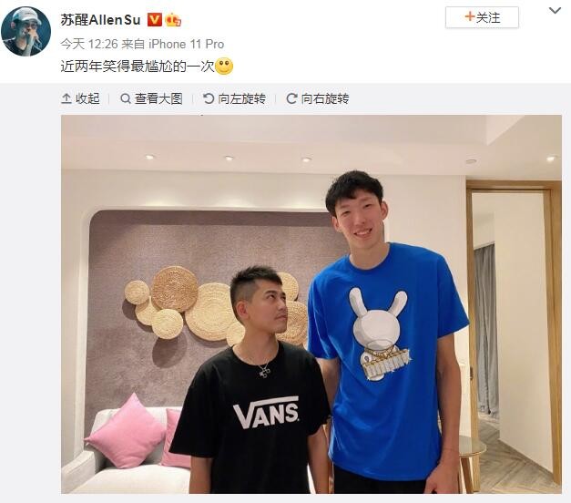 直播吧9月2日讯今日,艺人苏醒在社媒上晒出与周琦的合影数张,并配文写道:“近两年笑得最尴尬的一次。”值得一提的是,辽宁男篮控卫、周琦好友赵继伟调侃道:“你肯定垫(踮)脚了。”苏醒尴尬地回复道:“做人要