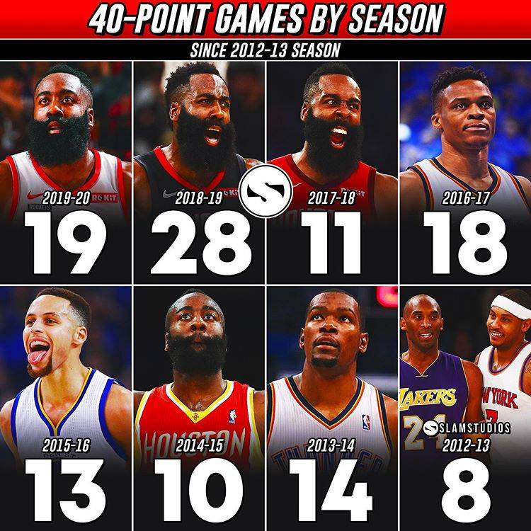 3月19日讯 美媒SLAMSTUDIOS近日盘点统计了近8年来NBA每个赛季得分40+次数最多的球星,一起来看看吧: