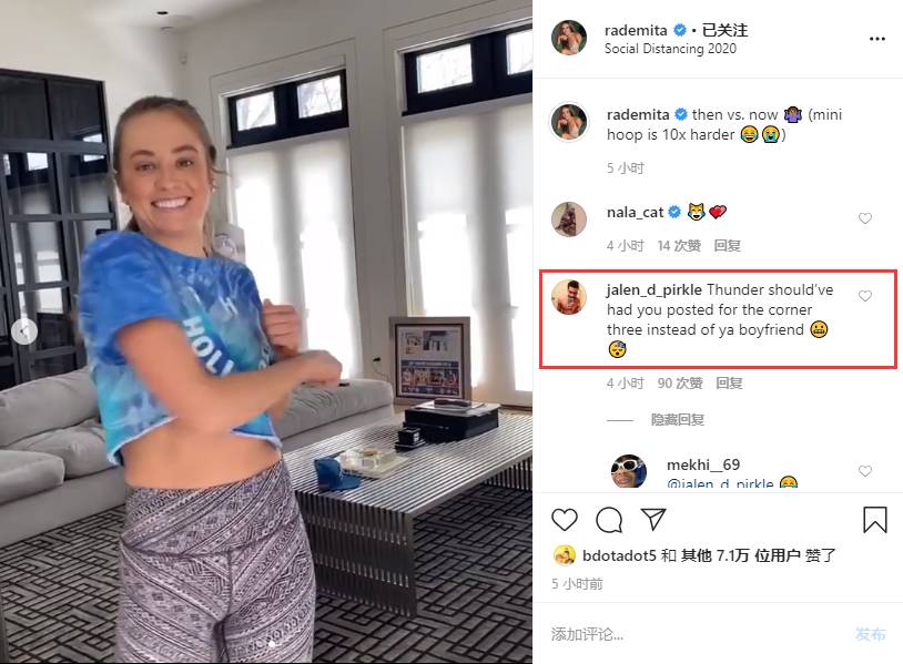 有网友评论道:“雷霆应该让你去替你男友(罗伯森)投底角三分”。