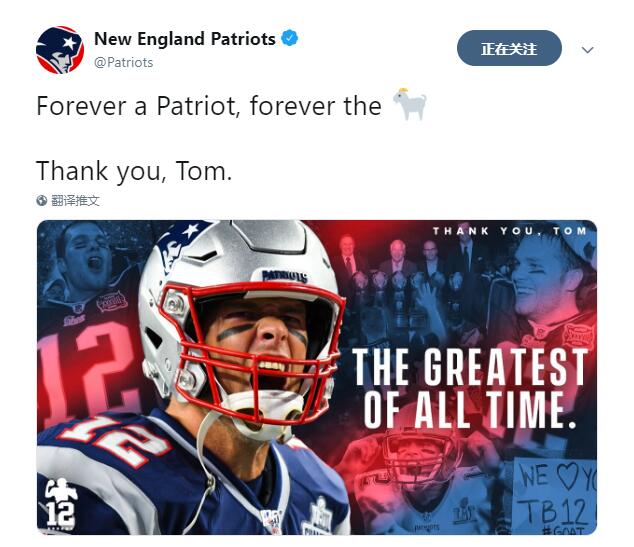 爱国者官推写道:“永远是一个爱国者人,永远的GOAT(历史最佳)。谢谢你,汤姆(布雷迪)。”
