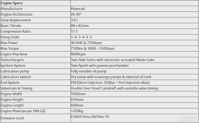 根据官方资料显示,这台全新的3.0T涡轮增压V6引擎,采用了源自一级方程式的多项技术开发而出,气缸的点火顺序为1-6-3-4-2-5,而机头重量低于220kg,可在7500rpm下最大输出436kW(629PS),3000-5500rpm的峰值扭矩为730N·m,而最高转速可达8000rpm。此外,新引擎还首次带有双火花塞的预燃系统,在传统燃烧室火花塞电极之间,通过设有几个特殊的连接孔,将预燃室与侧向火花塞连接。从而实现更充分的燃烧。同时,间接双喷射系统还有助于降低转速范围内的低频噪音,并有效改善燃油经济性,降低二氧化碳排放量。