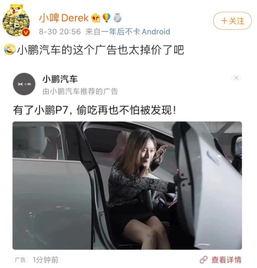 近日,微博网友@小啤Derek爆料称,一则“有了小鹏P7,偷吃再也不怕被发现”的广告语,出现在疑似小鹏汽车官方账号下,同时下方附有一张女性下车的图片。