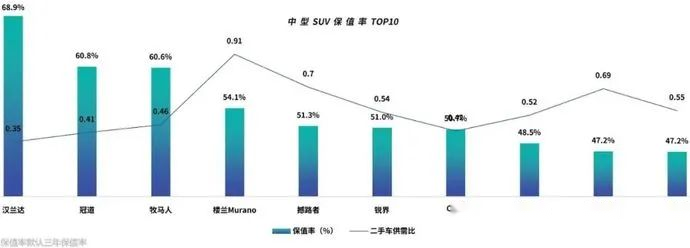 在中型SUV这个级别的保值率中,前3名分别是丰田汉兰达本田冠道,以及Jeep的牧马人。从报告中我们可以看出,在中型SUV这个领域里,日系车出现的频率慢慢开始降低了,呈现出了中、美、日呈三足鼎立的一个状态。