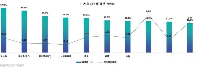 在中大型SUV这个级别的保值率中,前3名分别是丰田普拉多(国产),普拉多(进口),以及三菱的帕杰罗。可以看到在这个领域里,日系的硬派越野车同样是霸榜的节奏。其中堪称“理财产品”的普拉多,无论国产还是进口的车型,都有着超高的保值率。另外,三菱的帕杰罗也力压兰德酷路泽挤进了榜单的前三名。
