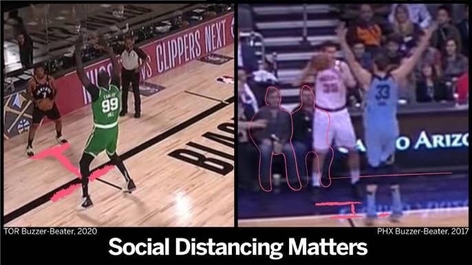 赛后,美国数据分析师Kirk Goldsberry晒出一张对比图(见上图)。左边是今天阿奴诺比命中绝杀之前洛瑞面对法尔发球的瞬间,右边是2017年一场比赛,本德尔面对小加索尔发球的瞬间。如图所示,由于空场比赛,洛瑞得到了几乎比本德尔大一半的发球空间。