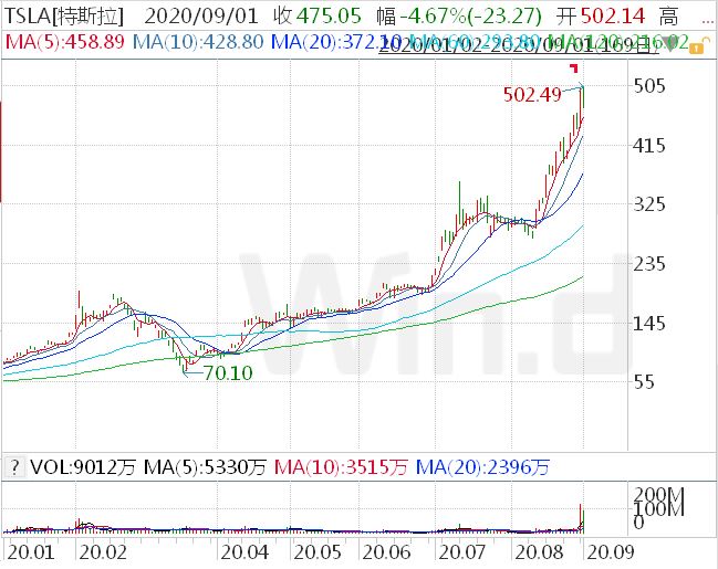 但特斯拉近期大涨又无关“基本面”。比如该公司在8月11日宣布拆股,这不会改变任何基本面的东西,但是该公司股价在宣布拆股到本周一,已经上涨了80%以上。