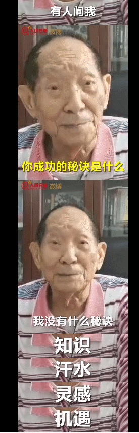视频中,袁隆平表示,经常会遇到有人向其讨要成功秘诀,他认为,自己没有什么秘诀,“我的体会是,我有八个字,知识、汗水、灵感和机遇,机遇宠爱有心人,世有伯乐,然后有千里马,好的机会都有,但如果你不是有心人,你没有经验,没有追求,那个机会就放过了。”