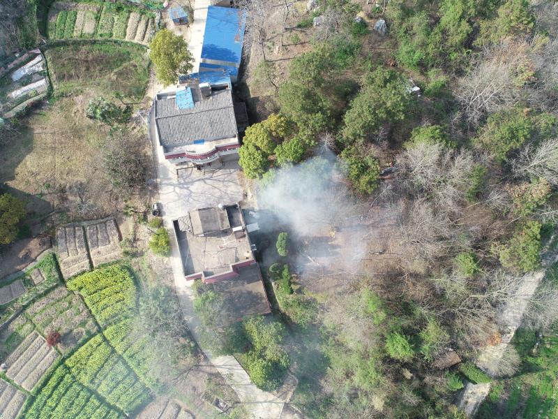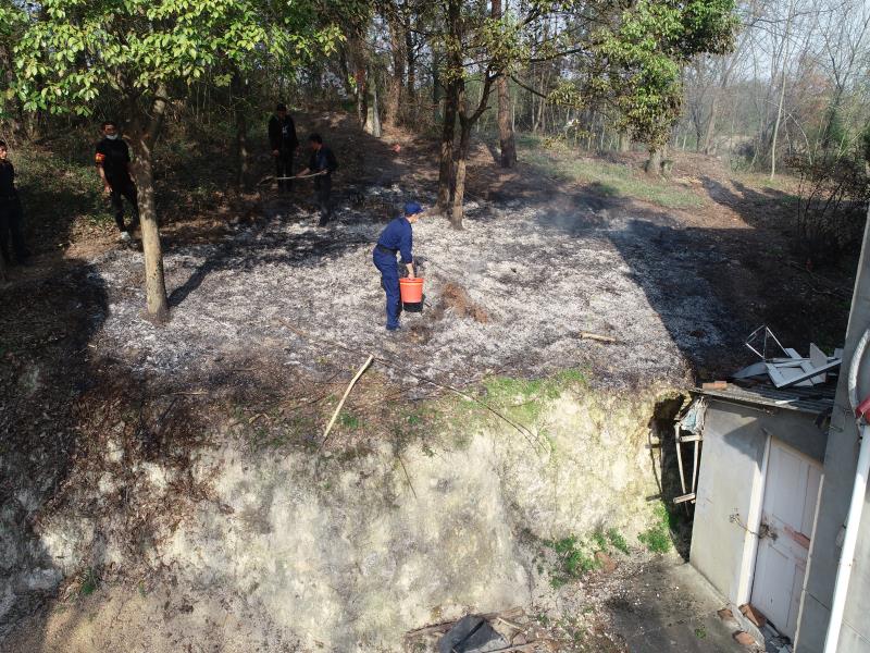 当日16时许,消防指战员在在楼牌村上空执行农村防火巡航任务,发现一民房旁草地浓烟四起,附近紧挨着成片树林和房屋,由于近期天气干燥多风,火势燃烧旺盛,蔓延速度快,情况十分危险。“立刻疏散群众,迅速扑灭明火,保障自身安全。”指挥中心在收到警情后,立即下达战斗命令。“空中侦查队”一车三人根据定位迅速前往现场,由于农田纵横阡陌,山坡陡峭,消防车难以通过,侦查小组队员驱车到达起火点附近后,立刻携带器材爬坡赶往火势蔓延处,一边利用铁锹、铁扫把等工具在山间灭火,一边组织村干部和村民用工具划分出一段防火隔离带,防止火势蔓延。经过半小时的紧张扑救,火势被完全扑灭,队员利用无人机对起火点附近进行巡航,在确保无着火点、无复燃可能后,消防员对烧荒当事人进行了普法教育以及防火宣传。