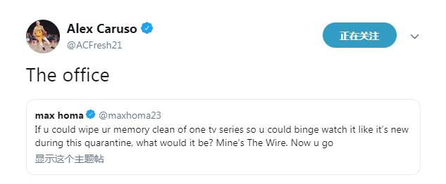Max Home的这条动态中这样写道:“如果你可以清除大脑中关于某一部剧的记忆,然后在隔离期间享用它,你会希望是哪部剧?我的是火线。”对于这个问题,卡鲁索的答案是《办公室》。