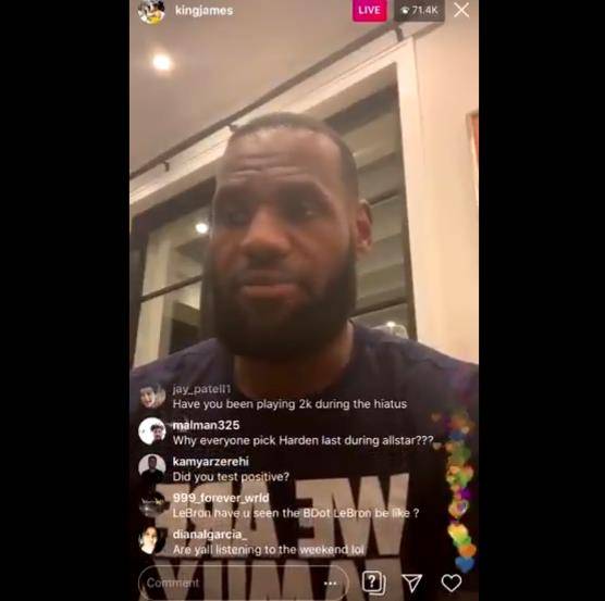3月20日讯湖人球星勒布朗-詹姆斯在Instagram进行了直播,同时回答了球迷的提问。
