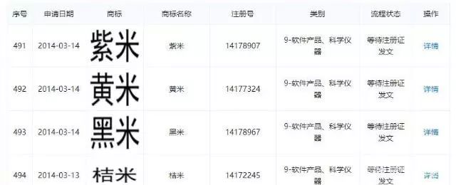 雷军把各种“米”都注册成了商标,除了“小米”和“红米”外,还有“紫米”、“橙米”、“黑米”、“桔米”,有网友评论道:“雷布斯是想集齐七色米然后召唤神龙吗?”