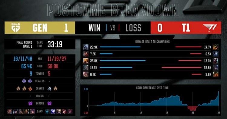 【19:15】Faker和鳄鱼在下路缠斗,Faker一波逆天操作直接秒杀鳄鱼,随后追击带走豹女、布隆,Gen葫芦娃救爷爷,被打出一波0换5。