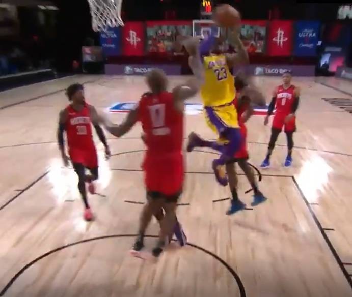 詹姆斯空中扭曲身体反手上篮造成And-1!姿态酷似韦德?2020-09-11 08:45:389月11日讯湖人与火箭的G4正在进行,上半场湖人57比41