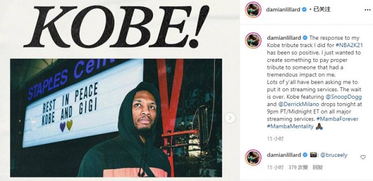 利拉德为2K21创作全新单曲《KOBE》今日上线2020-09-11 15:30:43 Instagram9月11日讯 今日,开拓者球星利拉德在自己的Ins上发布消
