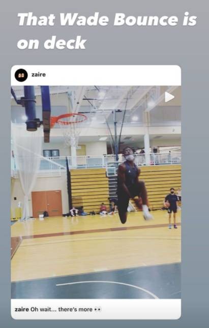 9月11日讯韦德的大儿子扎伊尔今日晒出自己的扣篮视频,胯下换手暴扣很是漂亮,老爸韦德随后也是转发了扎伊尔这条动态并写道:“这个韦德跳得是真高。”