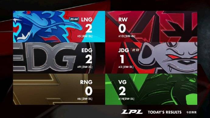 目前积分榜情况今日LNG和RNG一胜一负,LNG反超RNG来到第五的位置,RNG排名第六。此外EDG上升至第九,VG排名第14。