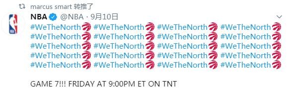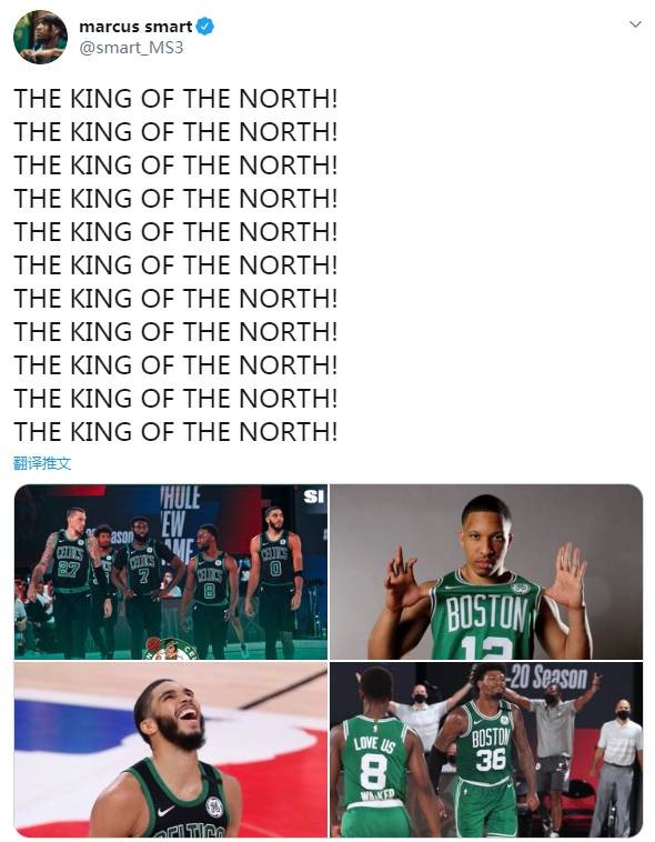 直播吧9月12日讯刚刚结束的东部半决赛,绿军力克猛龙赢下抢七进军东决。赛后,斯玛特十分激动地在推特上连发数个“THEKINGOFTHENORTH(北境之王)!”随后,他又转发了NBA官推在G6猛龙取胜