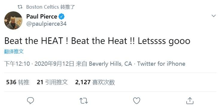 绿军名宿皮尔斯赛后就发推:“打败热火!打败热火!走起!!”