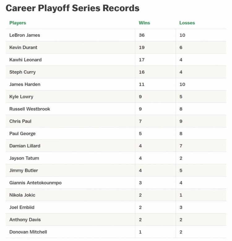 NBA不止有总冠军戒指,还有很多比胜负更重要的东西。倒在总决赛的舞台远比季后赛首轮出局有更多意义,高强度的季后赛里赢下任何一轮系列赛都不容易。总冠军并不能完全作为评价一支球队整个赛季成功与否的标准,这么做也很大程度上淡化了季后赛的魅力。The Ringer盘点了一些现役球星的季后赛战绩,其中有一些限制条件:以替补身份参与一轮系列赛的胜负不计算在内,比如2009年的洛瑞;系列赛一开始球员就受伤则不计算在内,比如2017年西决的莱昂纳德;德雷蒙德-格林和克莱-汤普森没有算进去,因为他们的季后赛战绩和库里是一样的。