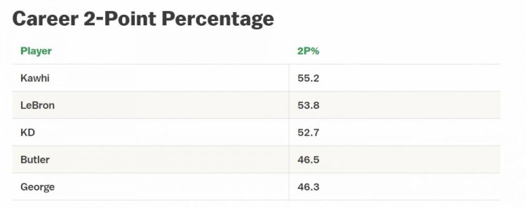 现役除了詹姆斯、杜兰特和莱昂纳德,还有两位顶级的锋卫摇摆人——巴特勒和乔治,不过和上述三位还有一些差距。巴特勒和乔治在进攻端、防守端都非常出色,但还没能在更高的舞台证明过带队能力。从季后赛两分球命中率也能看出他们和詹杜卡三人的差距: