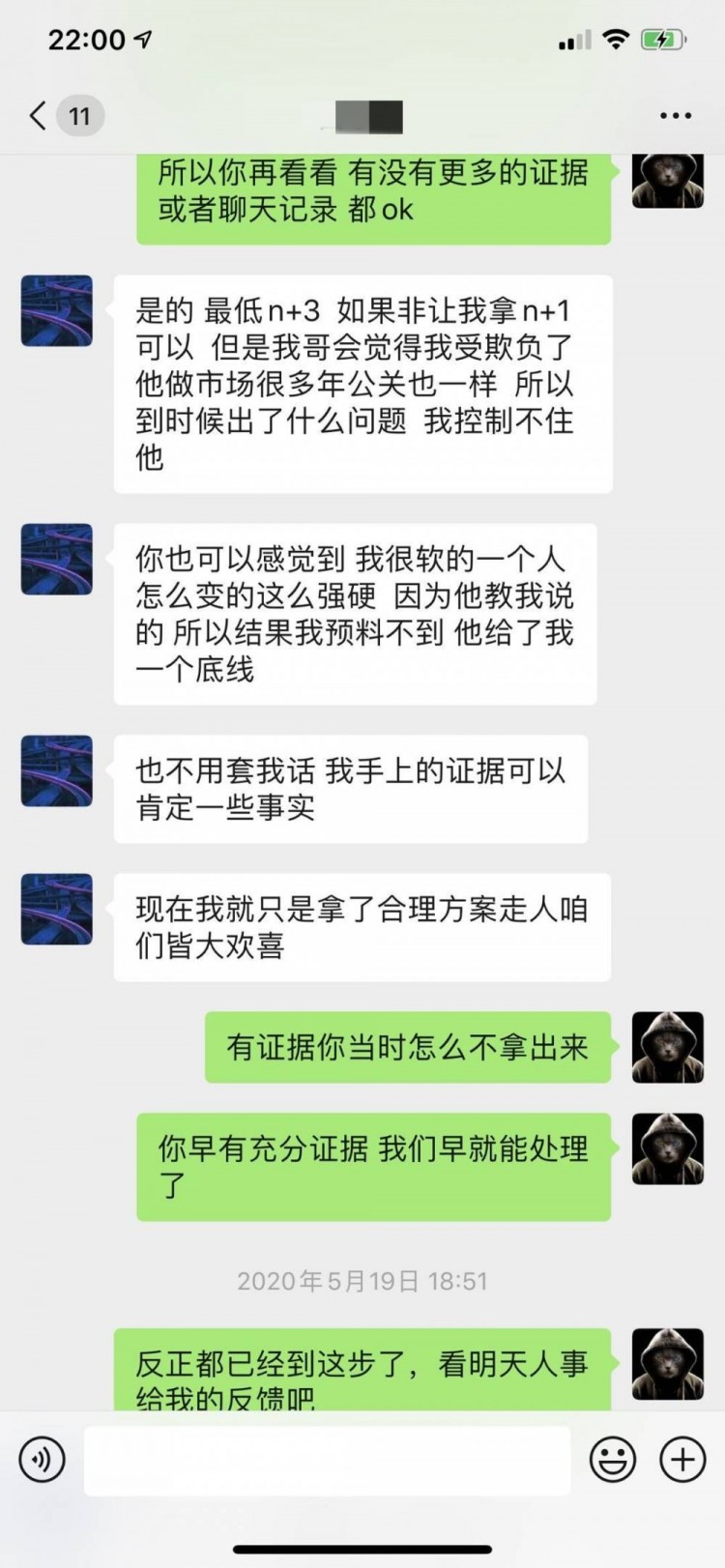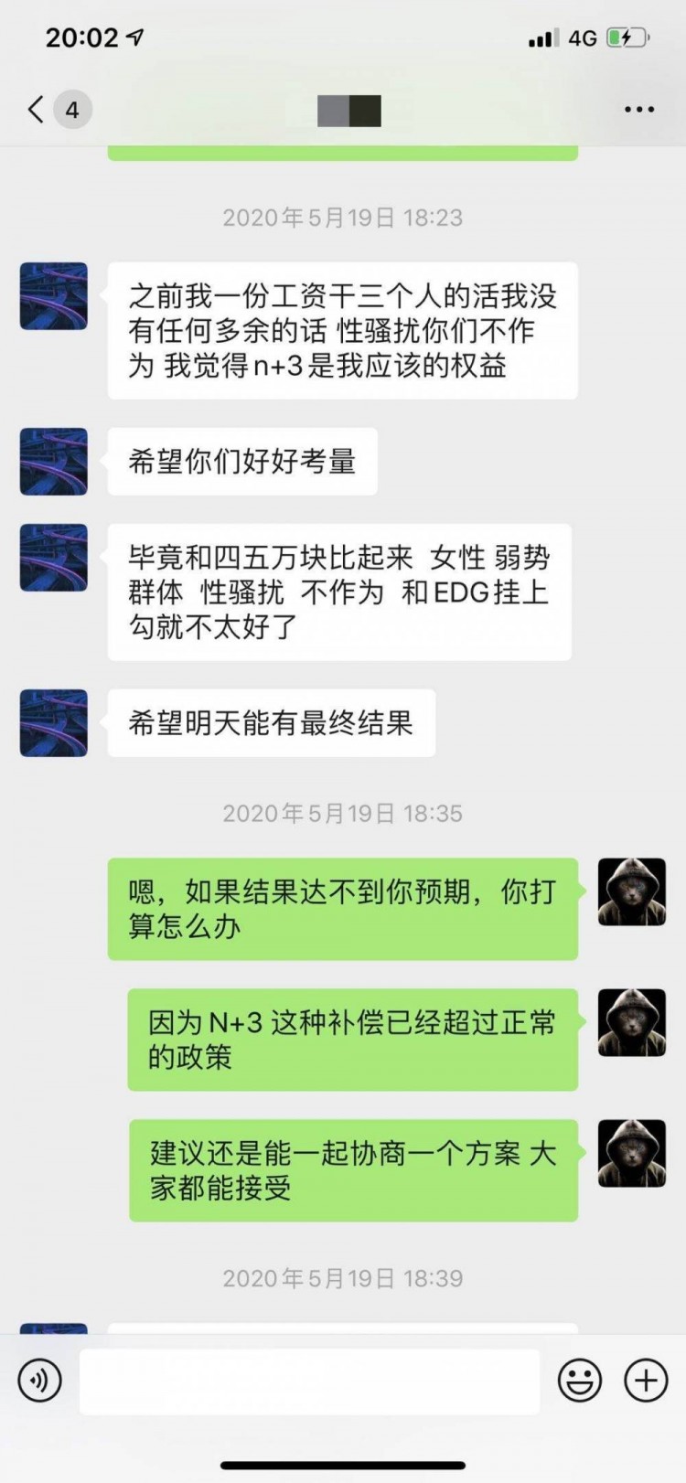 五、2020年5月19日,当事人在事件发生后,在无明确证据证明存在骚扰行为的前提下,向公司提出非合理赔偿要求,在被告知其索赔要求无依据后,威胁称将会让俱乐部付出代价。最终当事人于2020年5月22日离职。