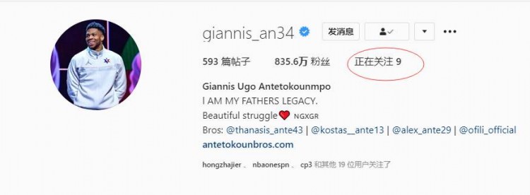 9月13日讯 美国媒体称,字母哥的社交媒体Instagram取关所有的雄鹿队友以及雄鹿队,而希腊前锋目前只关注9人,其中3位是他的兄弟
