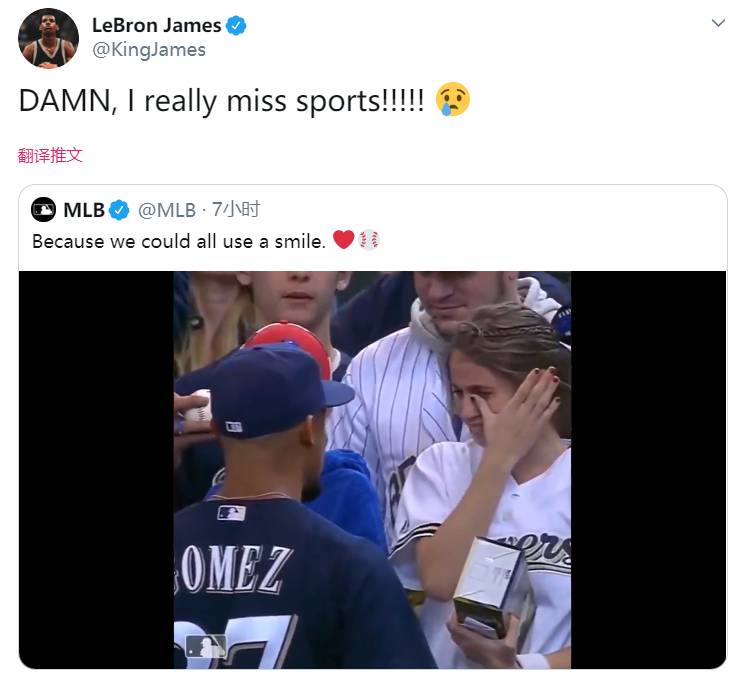 詹姆斯转发了一段棒球比赛的视频,并写道:“该死!我真太想念体育了!!#哭泣”