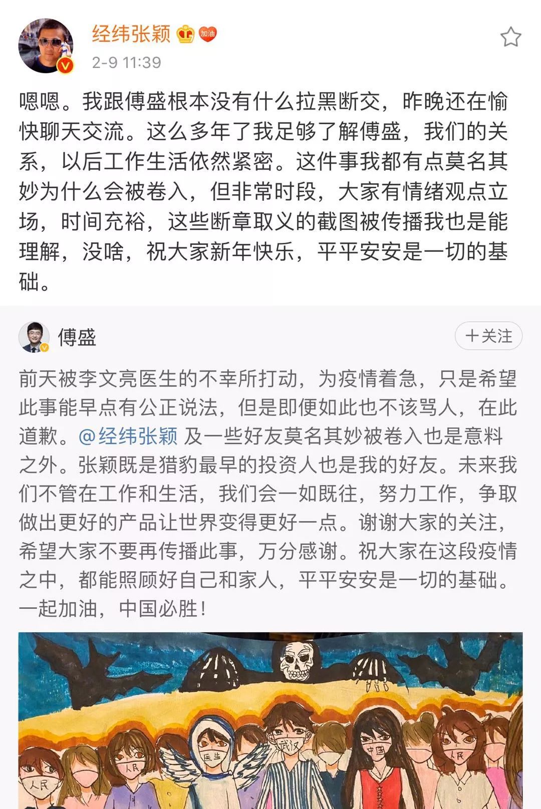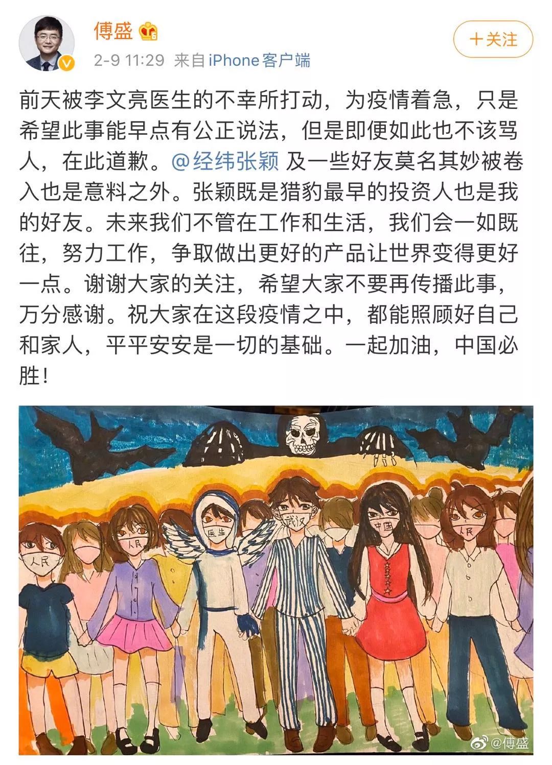 2月9日上午,傅盛就此事在微博道歉,傅盛称自己是被李文亮医生的事情打动,为疫情着急,希望能得到一个公正的说法,但也不应该骂人,为此道歉。