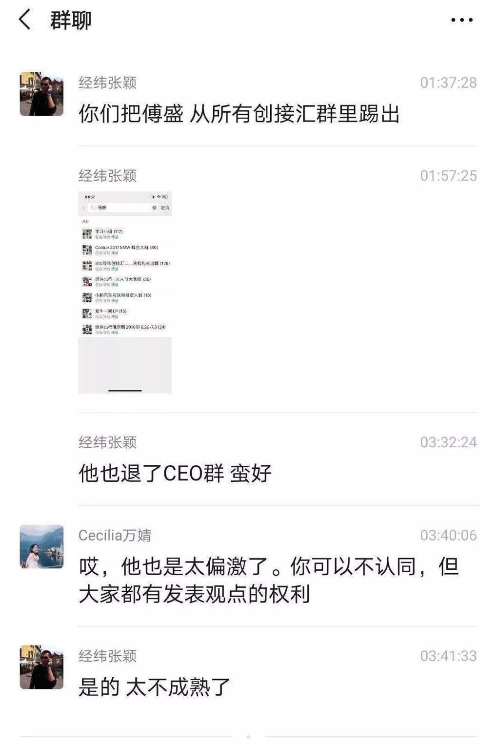 易到用车创始人、顺为资本合伙人周航表示,耻于和Peter温、Dylan为伍,希望二人主动退群,否则他们都会退群。周航还@经纬中国创始人张颖,要求张颖表态。