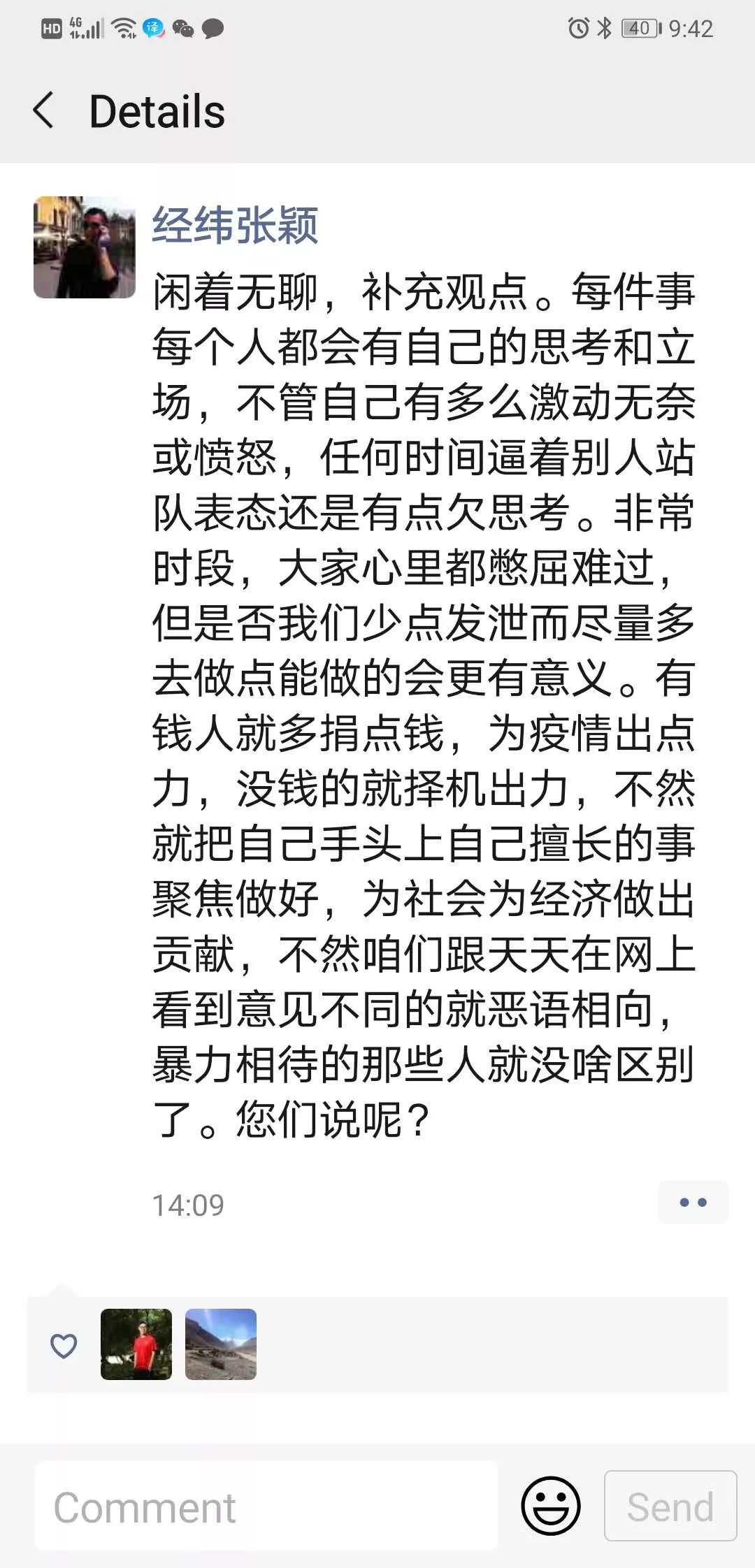 当天下午,经纬张颖在朋友圈对此事补充观点称,每件事每个人都会有自己的的思考和立场,不管自己有多么激动无奈或愤怒,任何时间逼着别人站队表态还是有点欠思考。有钱人就多捐点钱,没钱的就择机出力,把手头上自己擅长的事聚焦做好。不然就跟天天在网上看到意见不同就恶语相向、暴力相待的那些人没啥区别了。