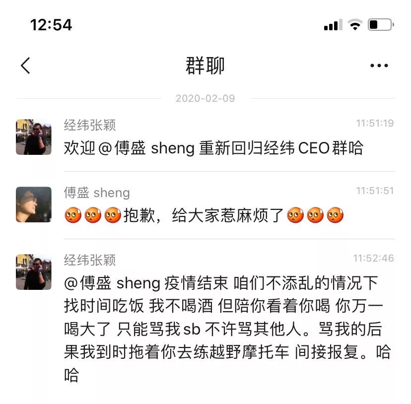 对于傅盛在群内爆粗口一事情,张颖表示,疫情结束后,自己陪傅盛喝酒,如果傅盛喝多了只能骂自己,不能骂别人。