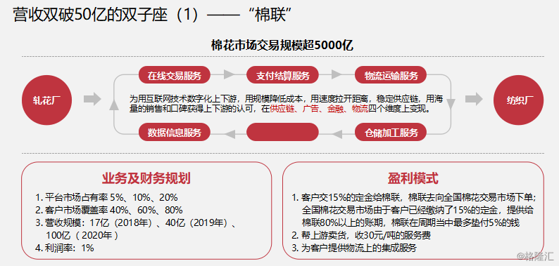 就其盈利模式而言,一方面,客户需交15%的订金给棉联,然后平台再向全国棉花交易市场下单。全国棉花交易市场会提供给棉联大概80%以上的账期,作为给客户提供的一个帐期,棉联在这过程中最多垫付5%的资金。另一方面,平台统一帮上游客户卖货,来赚取服务费。目前棉联团队只有40余人,但今年的营收规模却将超过50亿元。