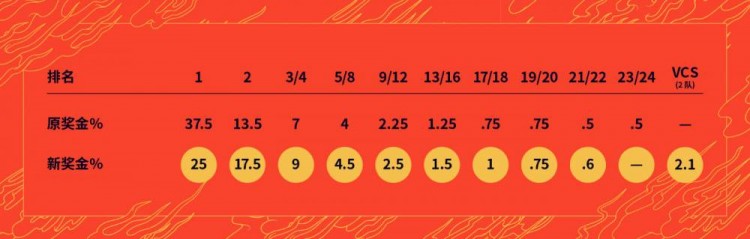 过去几年中,冠军皮肤的销售成绩渐入佳境,因此第一名和第二名之间的奖金差距也越来越大。为了达成更平等的结构,第一名的奖励将会削减并分配给其他决赛队伍,从而将全球总决赛的奖金池更好地分配给其余无法从全球总决赛皮肤售卖中获利的参赛队伍。我们在预计新结构的基础上做了一些调整,以便对未能参赛的越南赛区队伍进行补偿;今年我们支付的金额将高于奖金池的100%。