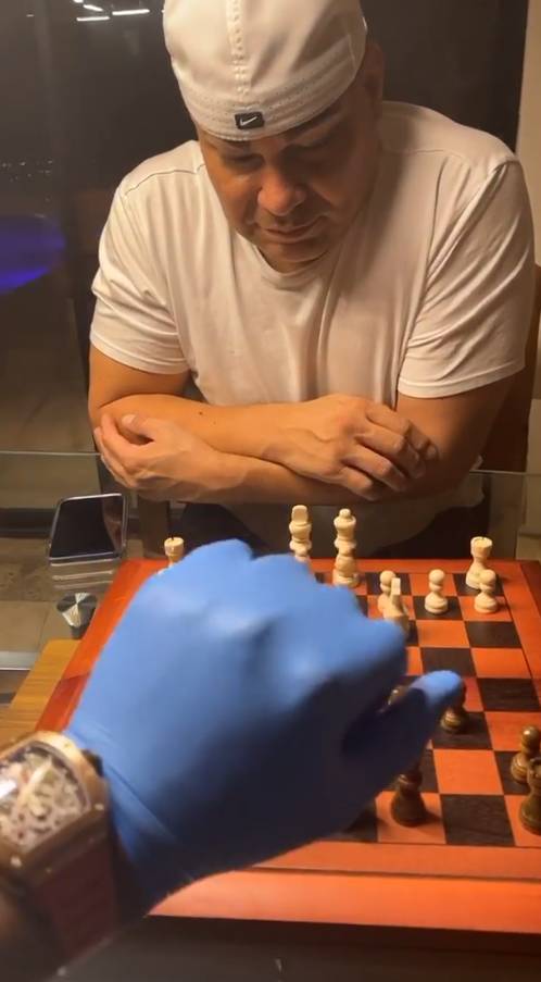 居家的他戴着手套与友人一起下棋,安全措施是做的很到位了,但是友人似乎还缺一个口罩呀。