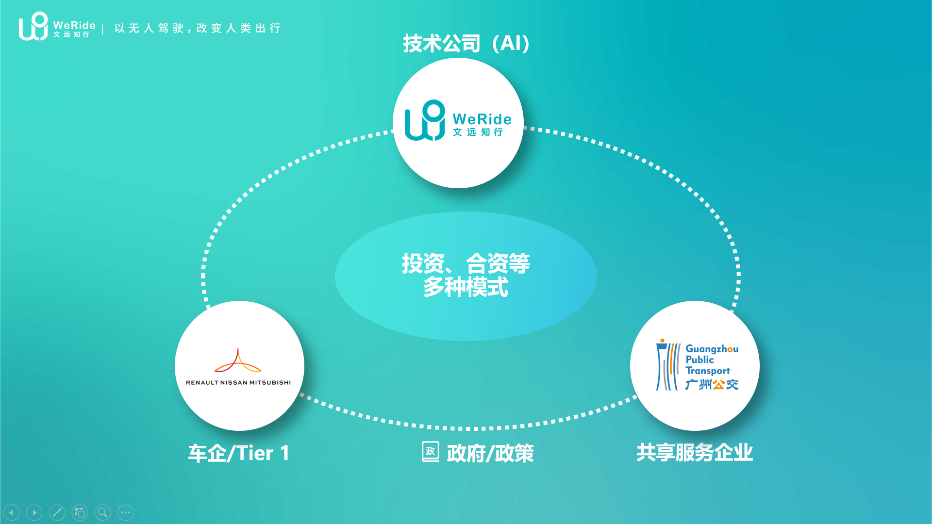 2019 年 08 月 07 日,文远知行再落关键一子,宣布与广州市白云出租汽车集团有限公司以及广州科学城组建合资公司——文远粤行。文远知行将三方的合作称为「铁三角模式」,目的是实现 AI 技术与车企、出行平台之间的战略协同,进一步探索自动驾驶的商业化落地。