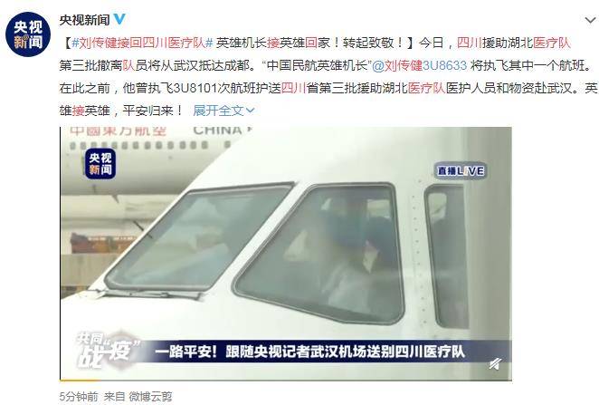 英雄接英雄!“中国机长”刘传健执飞四川援鄂医疗队撤离航班2020-03-21 14:20:23 微博3月21日讯 今日,四川援助湖北医疗队第三批