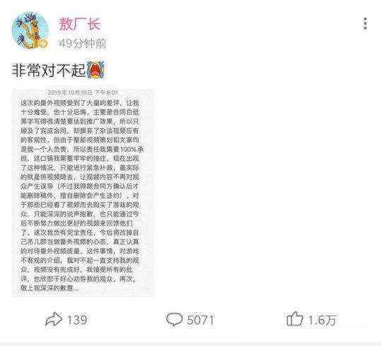 但是,为何这次的宣传视频会引起群情激愤?原因就在于这次敖厂长接的广告不被大多数观众认可,认为这是一个打着3A大作的名头,但整体质量却很一般的游戏。因此,视频一出来就引发大量观众的不满,愤怒的粉丝们喷他“恰烂钱”。一波一波声讨之下,敖厂长随后删除了宣传视频,并向粉丝们作出了道歉。