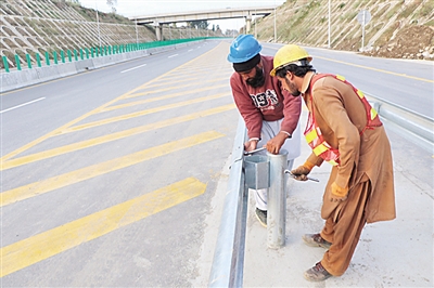 穆尼尔是喀喇昆仑公路二期赫韦利扬至曼塞赫拉高速公路段上的一名筑路工人。记者见到他时,穆尼尔正和工友一起对公路隔离带护栏进行最后的加固工作。“本路段的通车仪式马上就要开始了。等公路完全通过检验之后,就可以投入使用了。”穆尼尔对记者说,“我非常荣幸自己能在这个项目工作。”